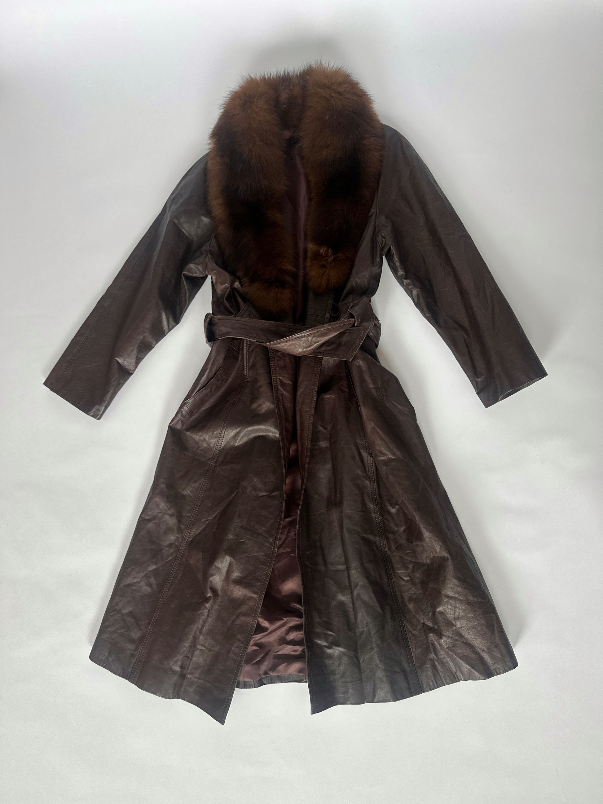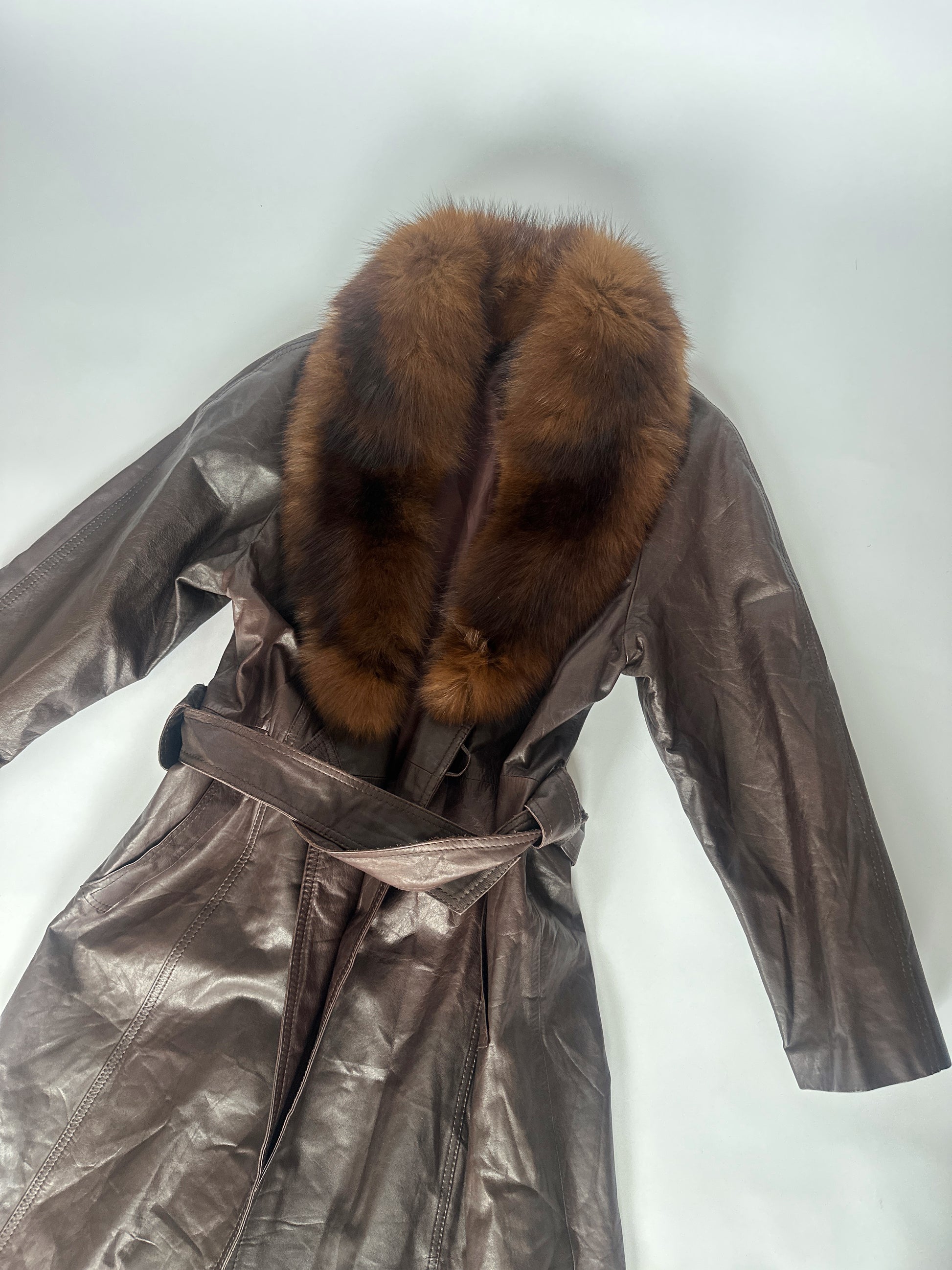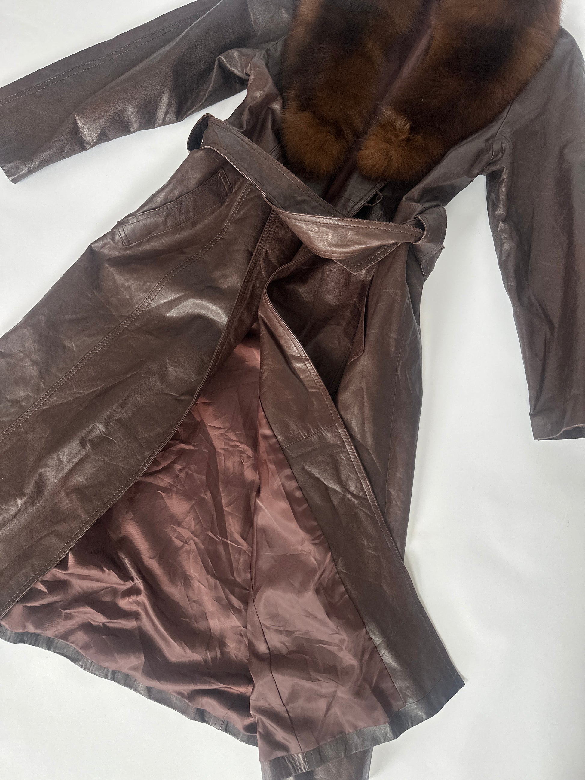 Vintage brown belted leather fur trim collar midi coat jacket.